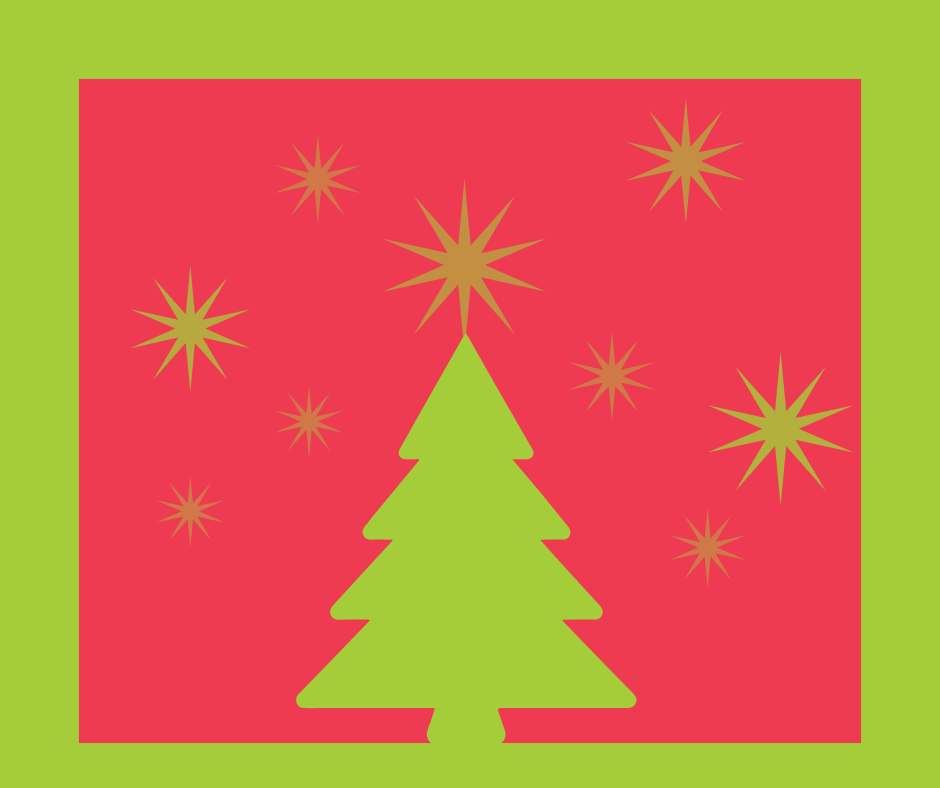 The simple outline of a Christmas tree and stars on a red background. The Christmas tree and stars are lime green.