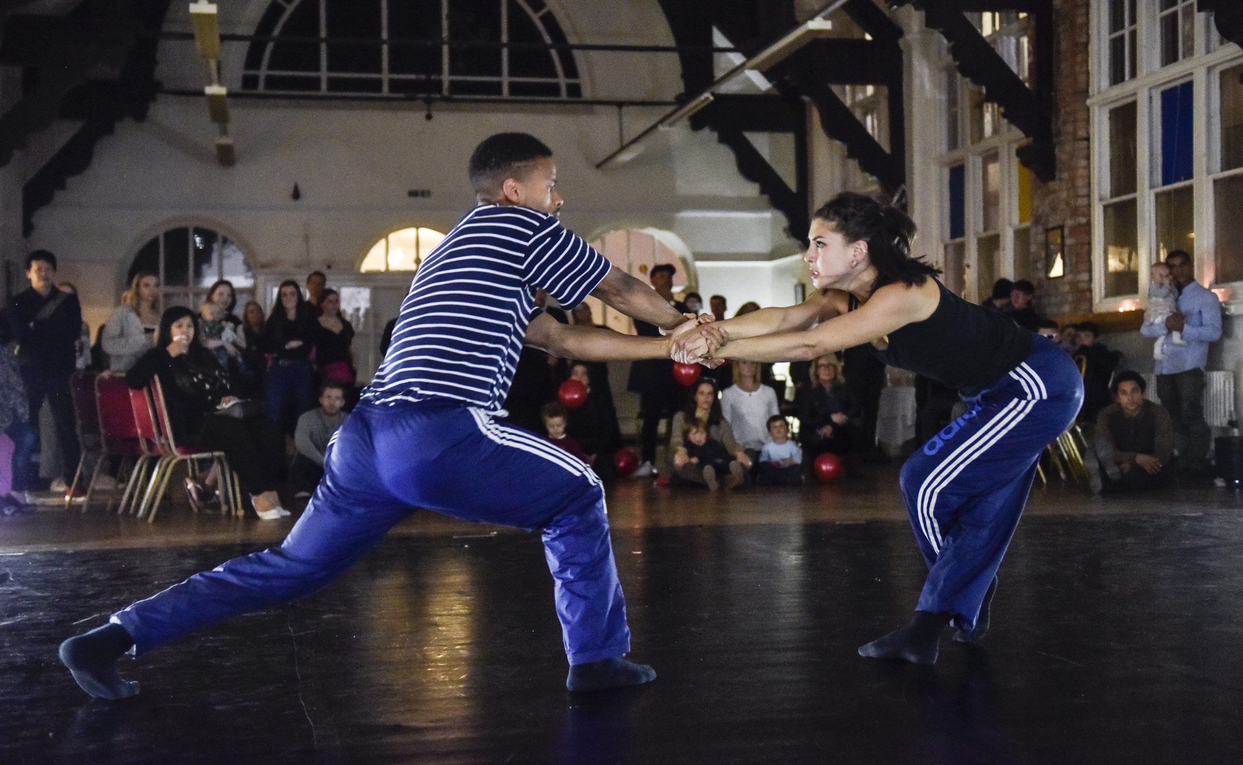 Two male dancers performing outdoors with a brick building in the background.