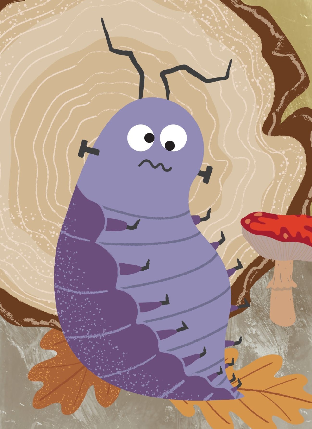 An illustration of a large purple bug with two antennaes and a puzzled expression on its face.