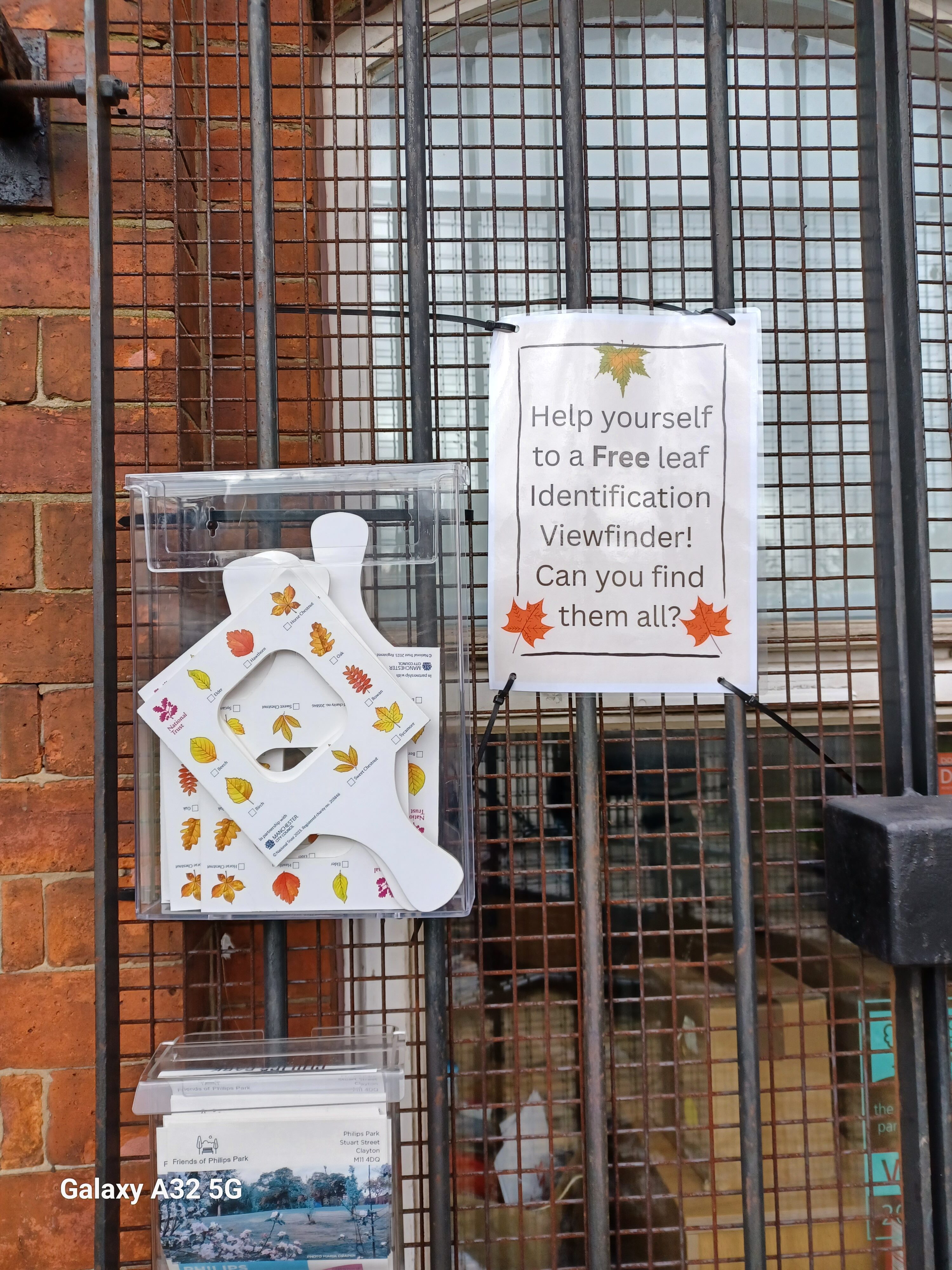 A leaf identification viewfinder and a poster inviting people to join the self-led leaf trail around Philips Park.
